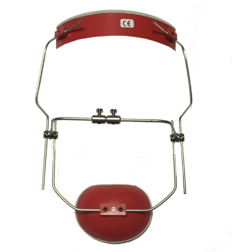Maschera di Delaire con appoggio frontale e mentoniera, regolazione tridimensionale lungo gli assi laterali. Disponibile nel colore rosso.