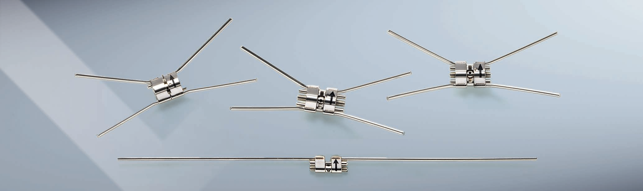 Viti speciali per espansione palatale estremamente stabili. Il particolare profilo anatomico riduce notevolmente lo spaziorichiesto sul palato.Bracci di ritenzione preformati saldati al laser , perni di guida stabili e perno filettato di grosse dimensioni raggiunge la massima sicurezza e trasmette la forza più facilmente La sezione centrale è un blocco ad elevata resistenza torsionale quando allungata. Blocco antirotazione tramite boccola in plastica integrata.