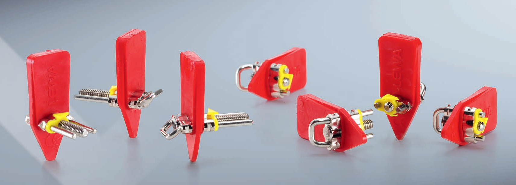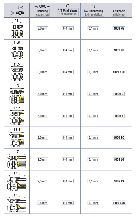 Perni guida a forma di U con diverse angolazioni facilitano il posizionamento della vite nell'arcata. Viti molto filigranate e ottima robustezza. Freccia di direzione gialla.